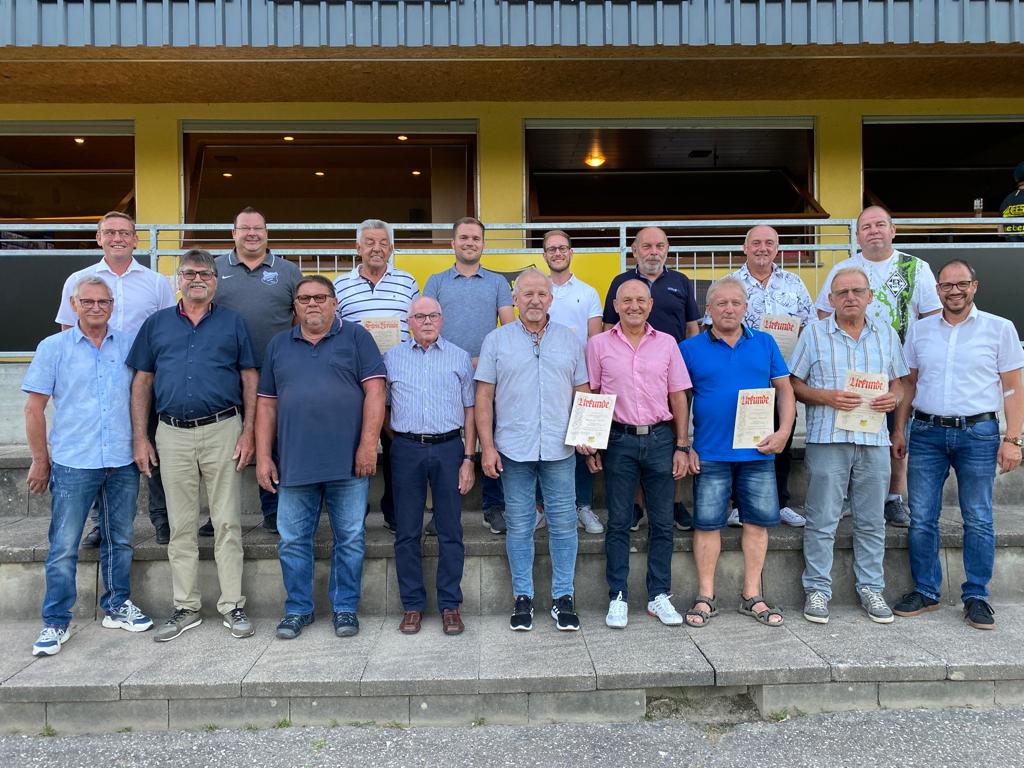 Die Aufnahme zeigt die Geehrten mit Vorsitzendem Daniel Scharer (obere Reihe links) und OV Mathias Köppel (untere Reihe rechts).